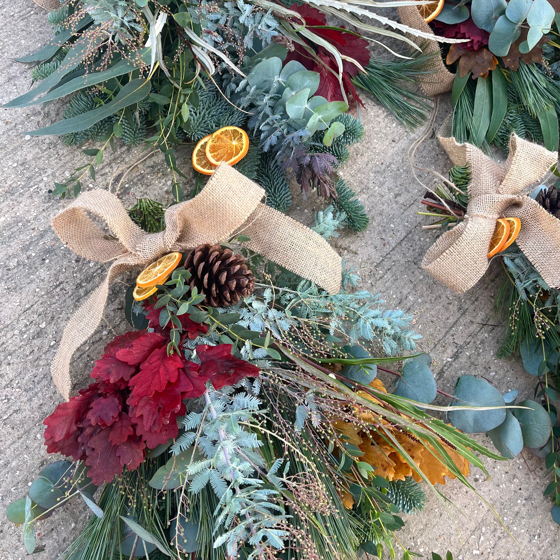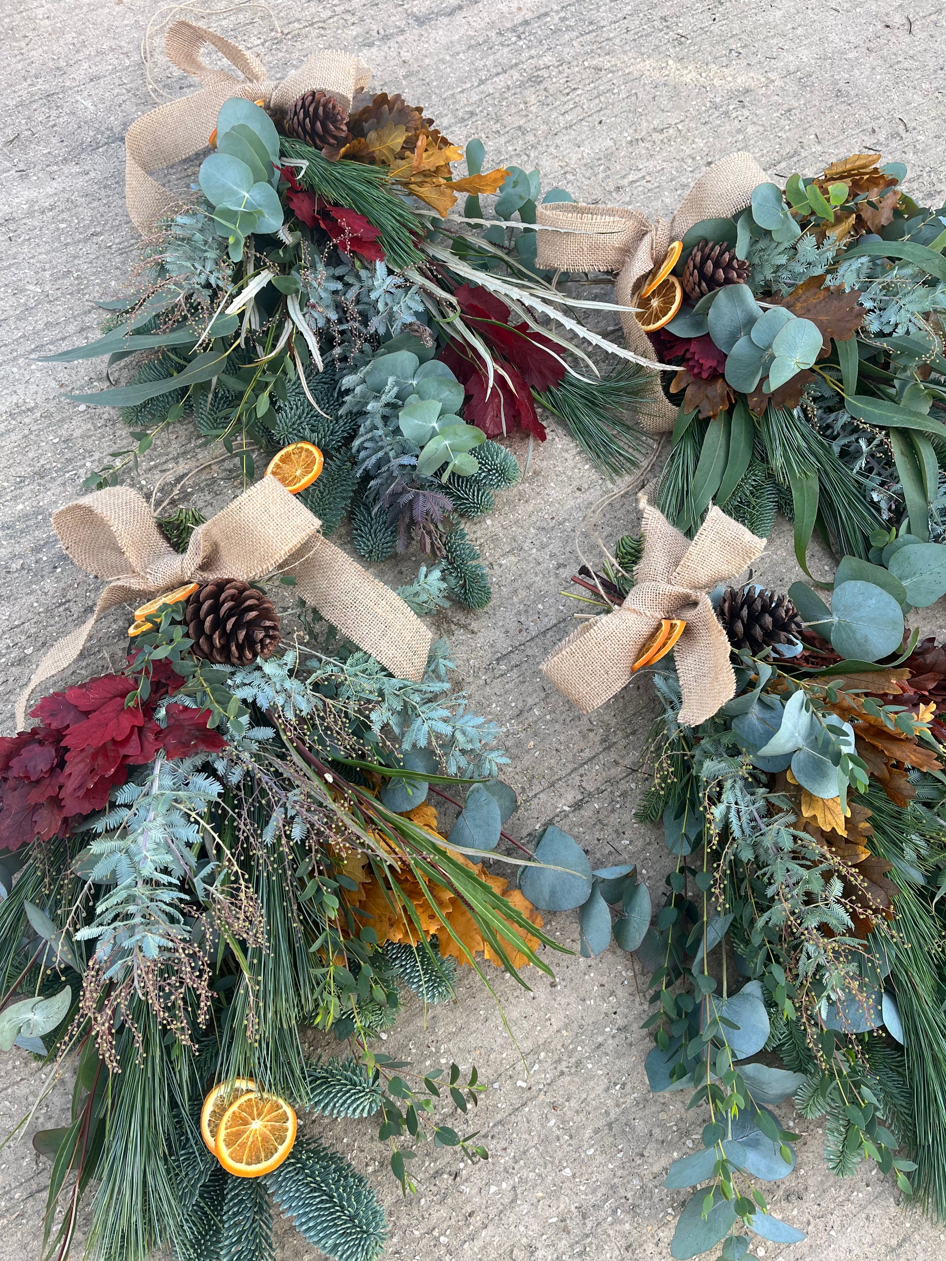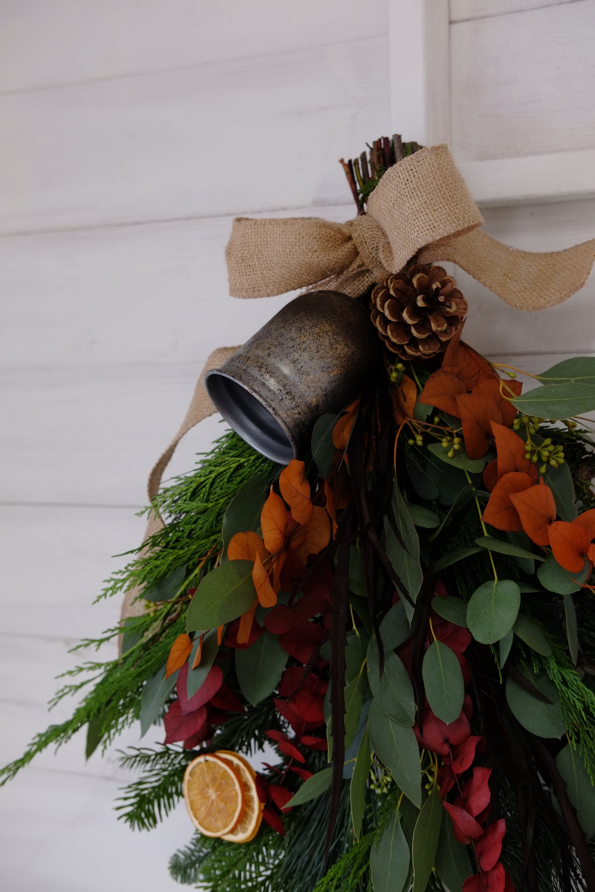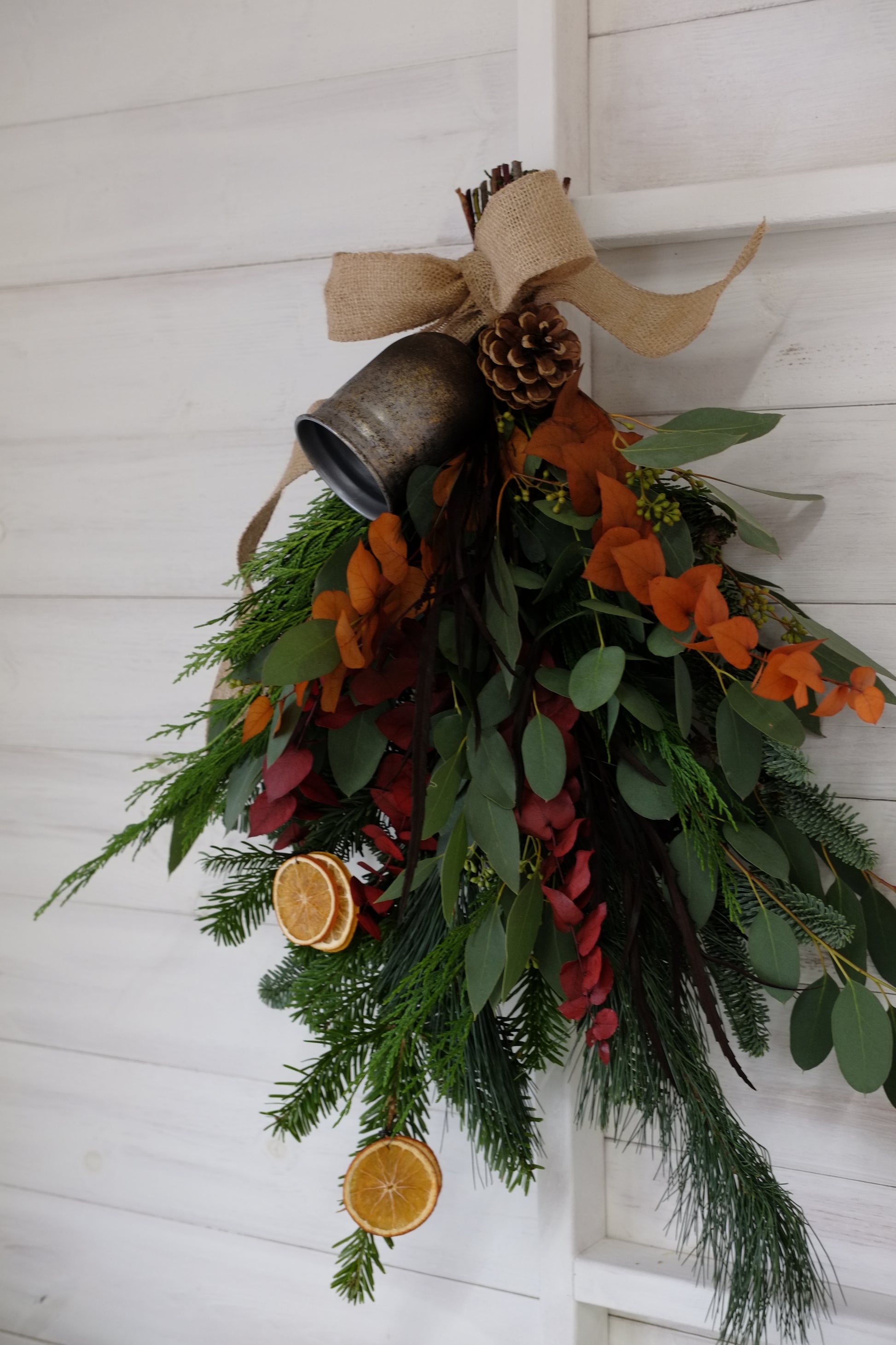 Hand made with spruce, pine, eucalyptus and some stunning festive drenched foliages. Finished with pine cones and dried oranges for the true feel of Christmas. A giant cow bell tops this swag to finish it off to sit on your door.