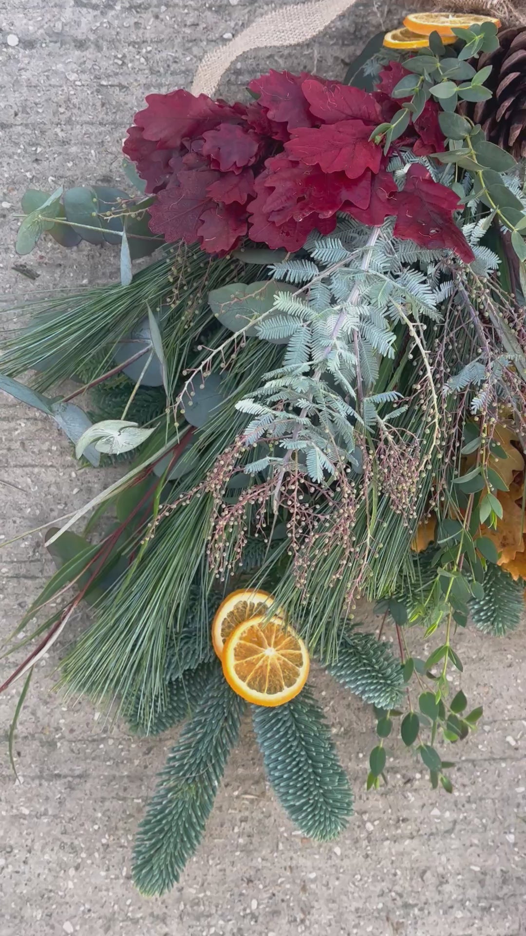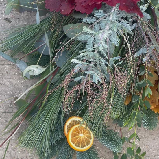 Our take on a modern day Christmas wreath, introducing the Christmas ‘swag’. Hanging like an upside down tree on your door, enjoy all the elements of a traditional wreath with this swag.