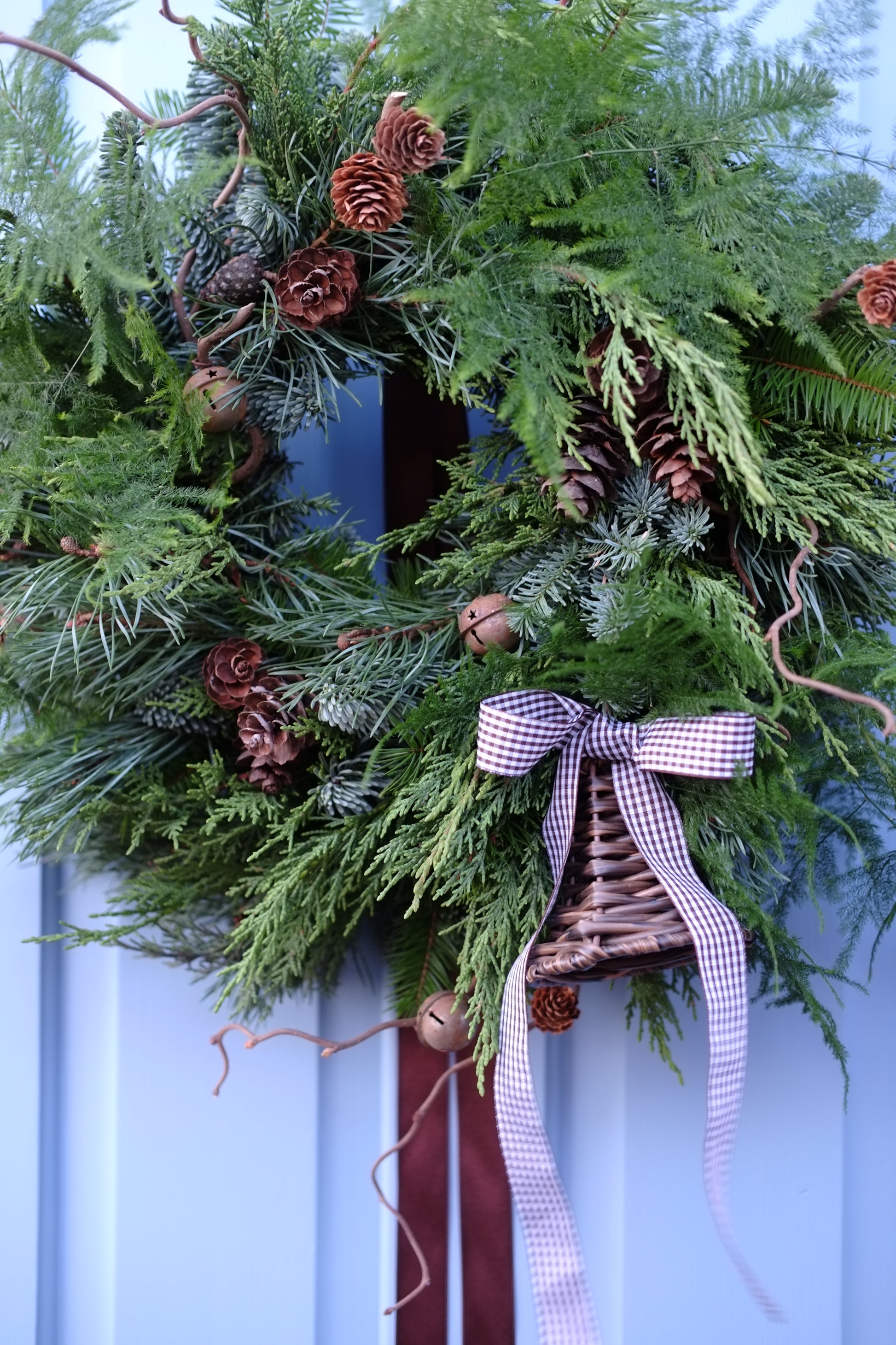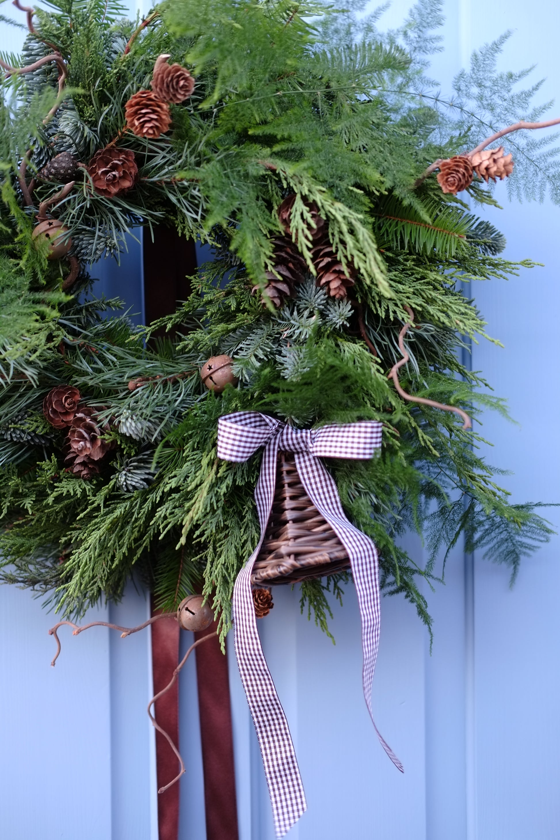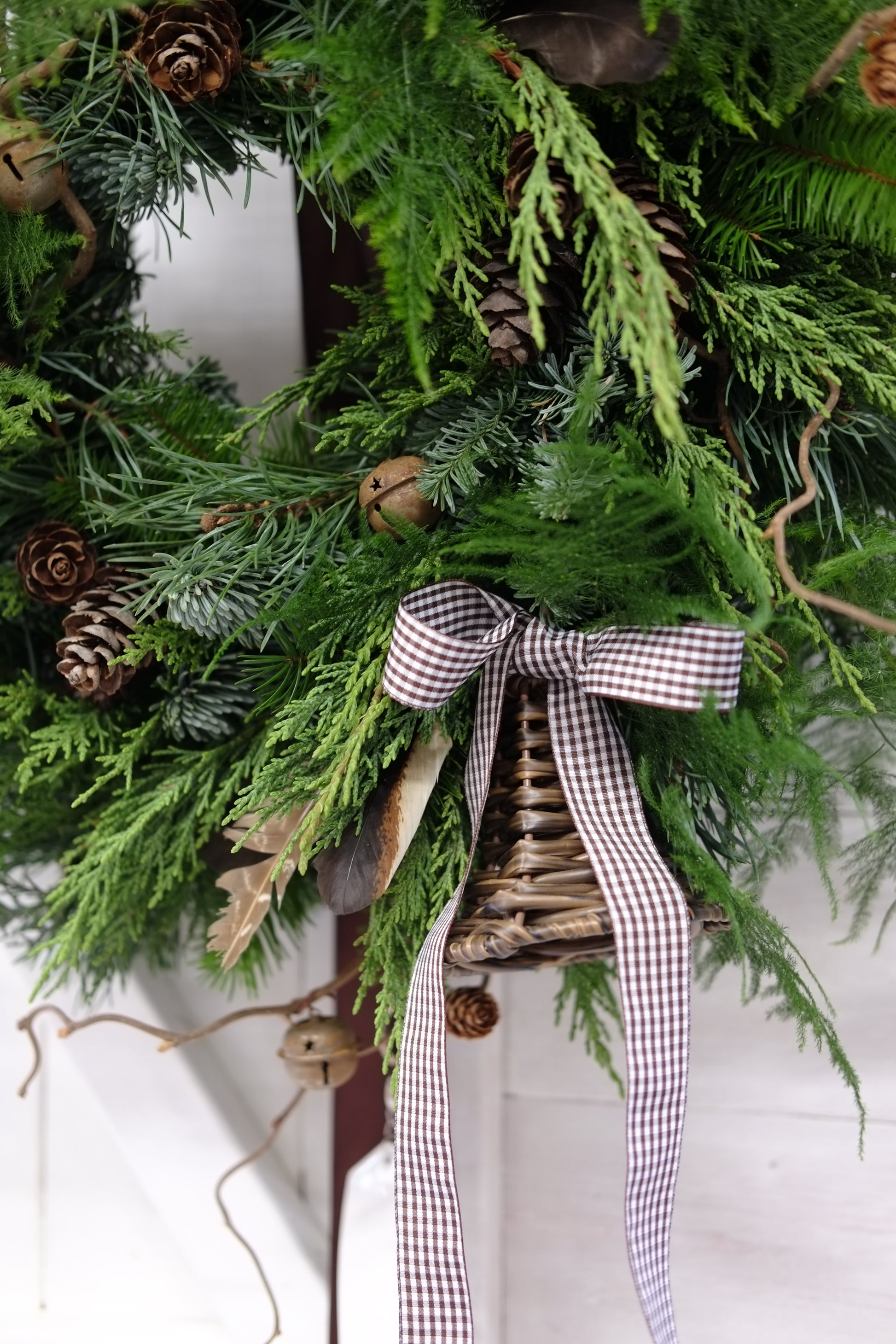 Hand made using a wire hay base and brought together with pine, spruce, conifer and all the chocolate goodness. An abundance of pine cones and corylus twigs adorn this wreath, finished off with a chestnut gingham bow and pheasant feathers.