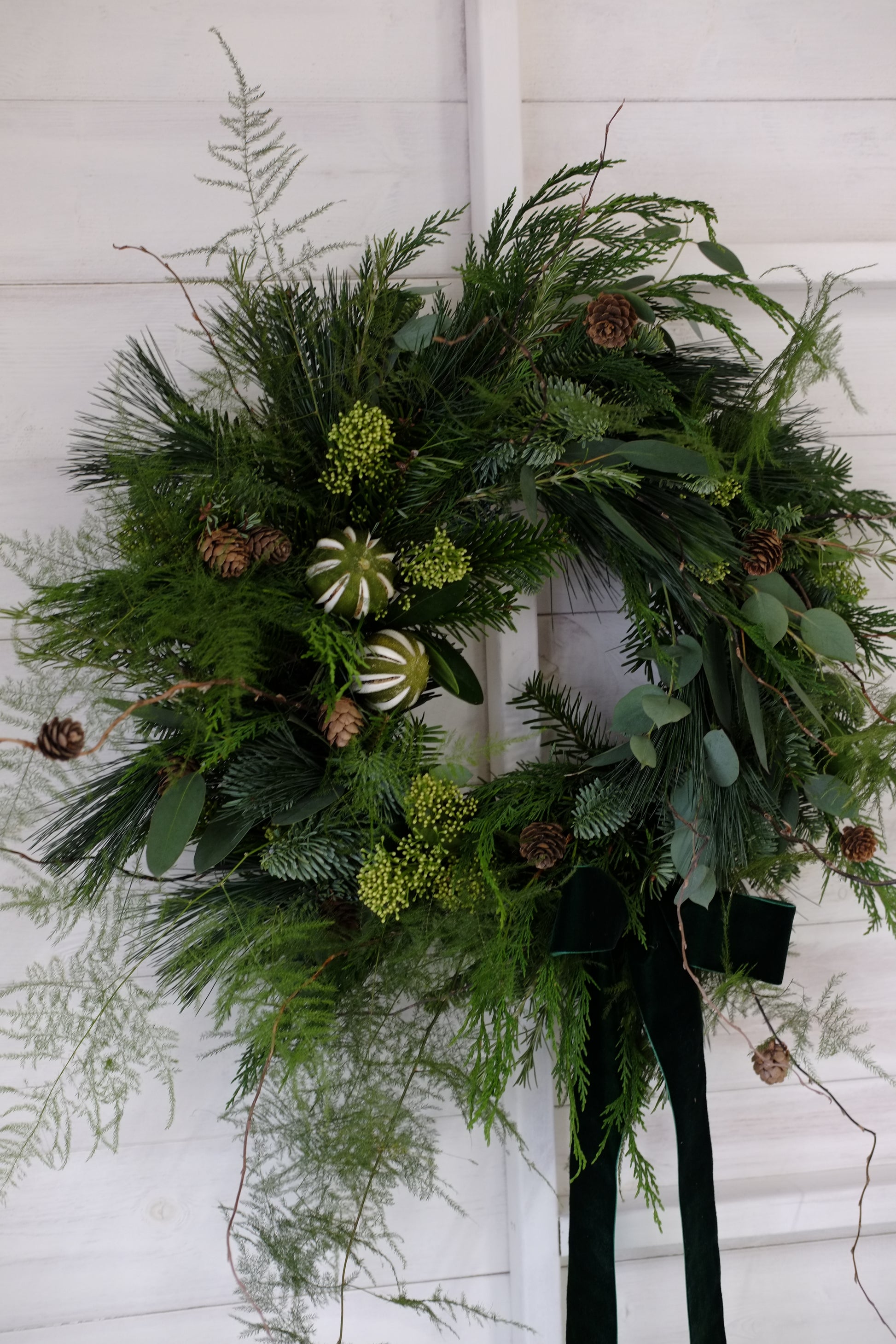 Hand made using a wire hay base and brought together with pine, spruce, eucalyptus and LOTS more foliage. Decorated with pine cones, dried limes and perfectly finished with a green velvet bow to adorn your front door this festive season.Â