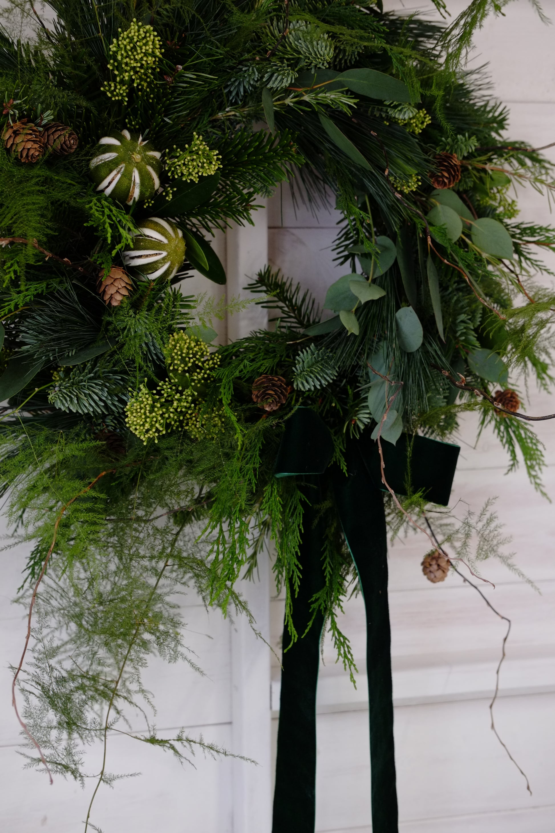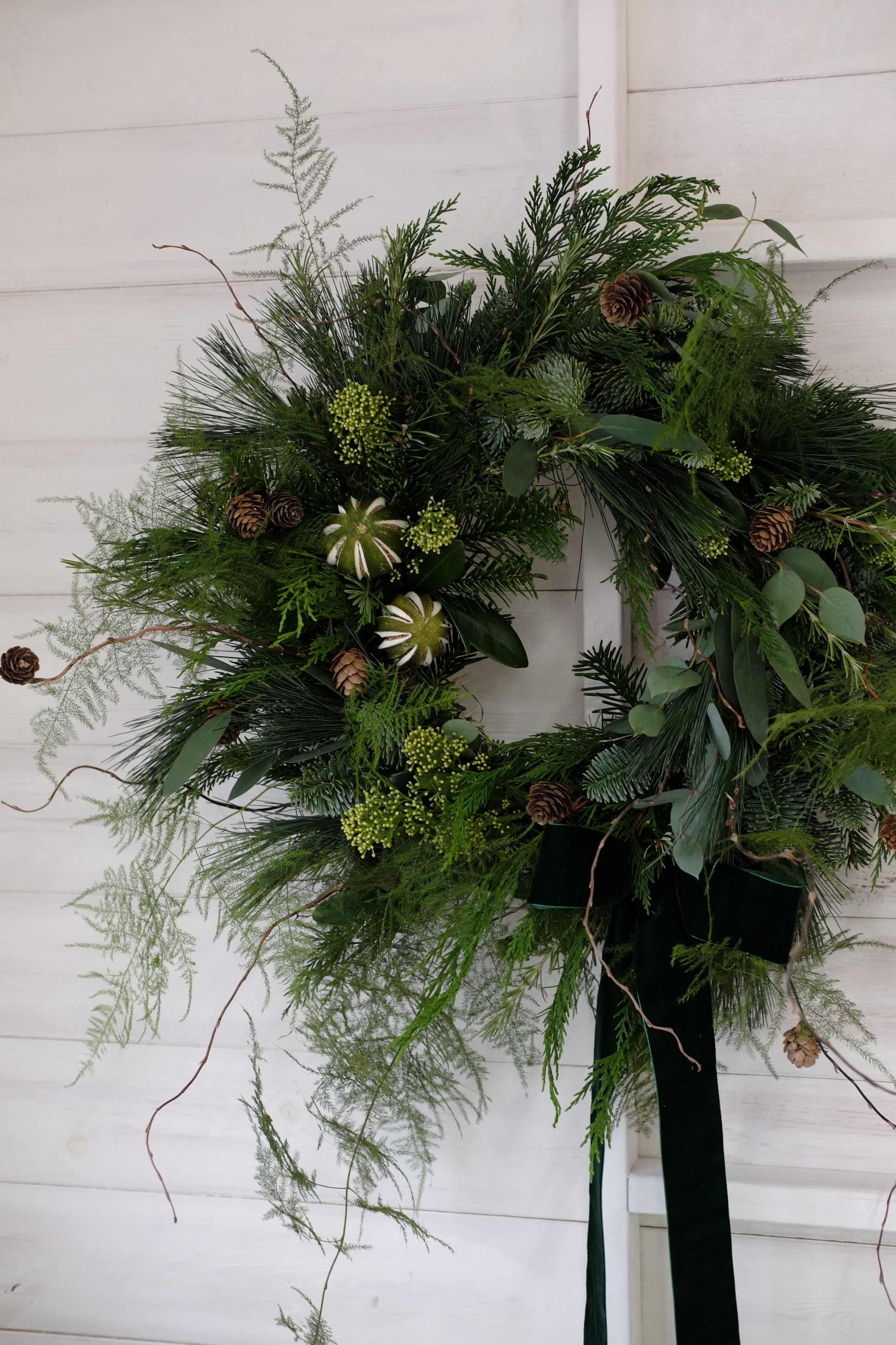 A modern, wild take on your traditional festive door wreath, made using an abundance of textured foliages, bringing together all the scents of Christmas.